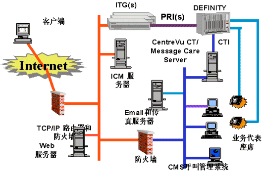 Internet呼叫中心(Internet Call Center簡稱ICC)是當(dāng)前的一個明顯趨勢。支持因特網(wǎng)作為呼叫中心的訪問渠道會極大增強呼叫中心的可用性。Internet用戶可以通過主頁瀏覽、電子郵件、在線Chat、IP語音電話等方式與話務(wù)員建立在線聯(lián)系,得到優(yōu)質(zhì)的服務(wù)。AVAYA的Internet呼叫中心解決方案支持用戶采用一條電話線進行因特網(wǎng)和IP電話的訪問,ICM管理器與Web服務(wù)器建立連接,將到來的IP呼叫進行自動分配,ITG IP電話網(wǎng)關(guān)實現(xiàn)將IP語音流轉(zhuǎn)換成語音信號,經(jīng)E1線送到Definity交換機后傳到話務(wù)員座席。座席和用戶可實現(xiàn)瀏覽器同步等功能。