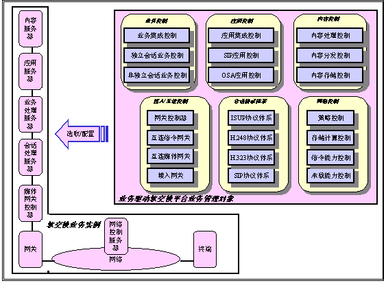 我們已經(jīng)看到,軟交換技術支持的電信業(yè)務能力一直在不斷發(fā)展,開發(fā)新的電信業(yè)務已經(jīng)成為電信運營商市場競爭的重要條件。事實上,業(yè)務能力是電信運營商或是電信用戶關心的基本問題,而不是實現(xiàn)這種業(yè)務的具體的技術和體系結構。選擇何種技術和結構,則是電信運營商依據(jù)自有的資源做出的選擇。因此,業(yè)務驅動的軟交換平臺需要根據(jù)實際的情況選取合適的技術和結構實現(xiàn)所需的業(yè)務。我們把實現(xiàn)電信業(yè)務中涉及的要素稱為業(yè)務管理對象。軟交換平臺涉及到以下的六類業(yè)務管理對象:會話協(xié)議體系、接入/互連控制、業(yè)務控制、應用控制、內容控制和網(wǎng)絡控制。會話協(xié)議體系是任何電信業(yè)務的基礎。對接入、互聯(lián)、業(yè)務、應用和內容的控制也是建立電信業(yè)務所必需的。網(wǎng)絡控制涉及到一個新業(yè)務和網(wǎng)絡全局的關系。除了平臺管理業(yè)務之外,每個業(yè)務管理對象均包含一個可選擇/可設計的集合,供業(yè)務設計時使用。所有這些業(yè)務管理對象的集合,構成了業(yè)務驅動軟交換平臺的控制功能的整體。下圖給除了業(yè)務驅動軟交換平臺上的業(yè)務管理對象,以及從這些業(yè)務管理對象映射的軟交換系統(tǒng)實例。