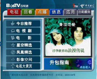 上海IPTV點(diǎn)播節(jié)目達(dá)3000小時(shí),包括電影、電視劇、音樂(lè)娛樂(lè)、紀(jì)實(shí)節(jié)目、少兒、體育以及教育等欄目。點(diǎn)播節(jié)目改變了“你播我看”的電視被動(dòng)接受方式,讓用戶可以根據(jù)自己的喜好來(lái)選擇喜愛的個(gè)性化節(jié)目,大大提高了用戶的喜愛度。值得一提的是,當(dāng)收看電影中途退出的時(shí)候,系統(tǒng)提供了“書簽”功能,下一次收看時(shí),便可以從書簽處繼續(xù),方便用戶使用和體驗(yàn)。另外,系統(tǒng)提供的“搜索”功能也讓百姓眼前一亮,尋找自己喜愛的影片就更方便了。