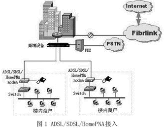 ADSL、SDSL、HomePNA接入方法都是利用普通電話線,采用頻分復(fù)用等技術(shù),將電話線分成多個(gè)傳輸通道進(jìn)行通信,它適用于無(wú)綜合布線的建筑物。這三種接入方式都可以在同一電話線上同時(shí)傳輸數(shù)據(jù)和語(yǔ)音。ADSL技術(shù)在一條電話線上最多可以實(shí)現(xiàn)上行1M、下行8M的不對(duì)稱高速數(shù)據(jù)傳輸;SDSL在一條電話線上能達(dá)到2M的上下行對(duì)稱傳輸速率,并且可以將多條電話線捆綁,實(shí)現(xiàn)2M、4M、6M、8M等多種傳輸速率;HomePNA在一條電話線上能達(dá)到1M的上下行對(duì)稱傳輸速率,尤其適用于小型企業(yè)和家庭用戶。以太網(wǎng)接入主要適用于有綜合布線,共享帶寬接入的情況,一般在樓內(nèi)機(jī)房配置出口路由器和交換機(jī),在每層配置樓層交換機(jī),將用戶直接連接到10/100M交換機(jī)端口,實(shí)現(xiàn)10/100M帶寬到桌面。如圖1所示。