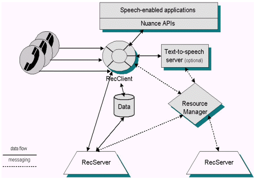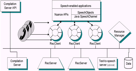 在特定配置下,呼叫控制和提示回放由Nuance系統(tǒng)外的組件控制,RecClient也可用于偷聽模式。最后,RecClient將音頻傳給識(shí)別服務(wù)器(RecServer),并將事件和結(jié)果回傳給應(yīng)用程序。