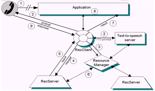 為了理解Nuance的結(jié)構(gòu),最重要的是大致了解識(shí)別過程,重點(diǎn)在客戶端、服務(wù)器和應(yīng)用程序。請(qǐng)注意,本篇試圖展現(xiàn)的是一個(gè)典型的簡(jiǎn)單過程,和實(shí)際過程可能有出入,實(shí)際情況則視集成伙伴實(shí)施的電話功能而定。下圖為過程的步驟,隨后是每個(gè)步驟的說明。
