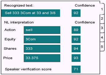 也可使用外部的應(yīng)用知識(shí)內(nèi)容來確定多結(jié)果中的哪一個(gè)是有效的。例如,經(jīng)紀(jì)業(yè)務(wù)應(yīng)用程序,它的用戶投資隨時(shí)間變化而變化。系統(tǒng)可使用簡(jiǎn)單的語(yǔ)法來識(shí)別股票證券的名稱。識(shí)別時(shí),系統(tǒng)產(chǎn)生一個(gè)最佳前N個(gè)股票名稱的清單,標(biāo)明假設(shè)的股票證券名稱。應(yīng)用程序然后將每個(gè)清單項(xiàng)目(由最佳到最差)和現(xiàn)有股票證券名稱進(jìn)行比較,從而為該用戶找到可能性最大的一個(gè)。下圖展示的是這些多結(jié)果情況,每個(gè)結(jié)果都可能有它自身的已被識(shí)別的文本、NL解釋和置信度分值。在這一例中,請(qǐng)求了五個(gè)識(shí)別結(jié)果。