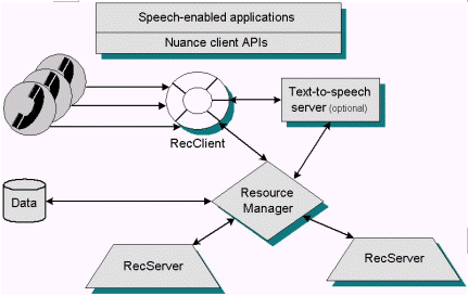 下圖說明RecServer和其它Nuance系統(tǒng)組件之間的交互情況。在每個(gè)交互過程中,由資源管理器建立連接,但RecServer和其它組件間的交互是直接進(jìn)行的。