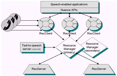 Nuance系統(tǒng)基于開放式客戶/服務(wù)機(jī)結(jié)構(gòu),特別為大型應(yīng)用程序所需的健壯性和可伸縮性而設(shè)計(jì)。呼叫者的講話由客戶端收集,而識(shí)別和鑒別處理的負(fù)載被平均分配到網(wǎng)絡(luò)上的多個(gè)分開的服務(wù)器上。