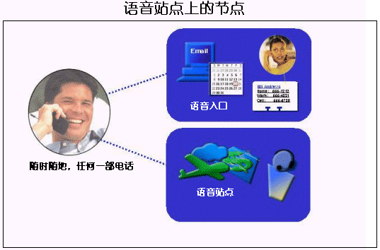 在語音網(wǎng)上,內(nèi)容和服務(wù)將會以兩種方式出現(xiàn)即個人語音站點(diǎn)和語音入口。語音入口和語音站點(diǎn)都屬于網(wǎng)絡(luò)上的節(jié)點(diǎn),這兩者由一個標(biāo)準(zhǔn)的語音瀏覽器連接起來,關(guān)于這部分內(nèi)容,將在以后進(jìn)行描述。