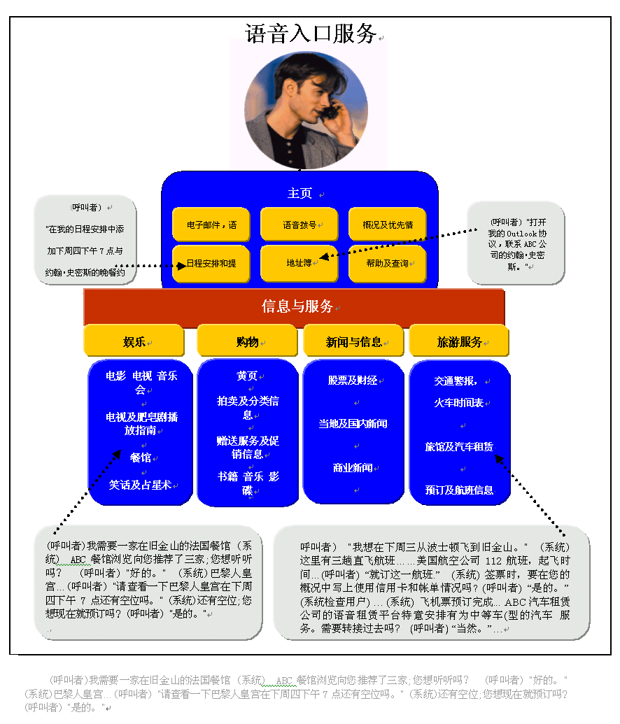 語音網(wǎng)最吸引人之處就在于它可以在一次通話中,同時處理多個任務(wù)。下圖表明一名商務(wù)人員是如何安排好與一個未來的商務(wù)旅行有關(guān)的一系列任務(wù)的。他獲取了對自己有用的信息,順利達(dá)成了一項(xiàng)語音商務(wù)交易,接收個人信息和辦公室的幫助,并撥打電話所有這些都是在一個同步過程中完成的。
