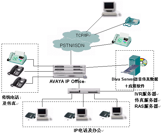 針對(duì)現(xiàn)代企業(yè)辦公通信的特點(diǎn)和要求,Avaya與Eicon經(jīng)過(guò)嚴(yán)格的產(chǎn)品互操作測(cè)試,及應(yīng)用調(diào)試共同推出了企業(yè)一體化辦公平臺(tái)解決方案,該解決方案整合了兩家公司的交換機(jī)、語(yǔ)音傳真板卡的各自優(yōu)勢(shì),既可以應(yīng)用于傳統(tǒng)的網(wǎng)絡(luò)環(huán)境,又能應(yīng)用于純IP的通信環(huán)境,將不同的應(yīng)用技術(shù)和網(wǎng)絡(luò)結(jié)合起來(lái),做到真正的辦公一體化。