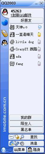從主界面來看,MSN Messenger 6.0基本沒有改變,而QQ2003則新增加了QQ短信和QQ游戲兩個(gè)按紐,同時(shí)增加了QQ郵件提示,這和MSN