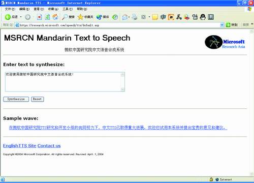 通過(guò)“木蘭”在線演示系統(tǒng):“http://research.microsoft.com/speech/tts”(中文)與“http://research.microsoft.com/speech/engtts”(英文),人們可以親身體驗(yàn)MSRA的研究成果。