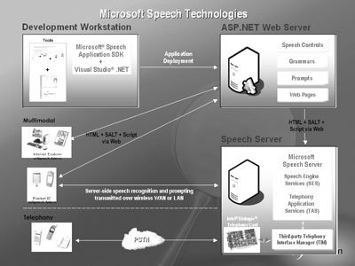在語(yǔ)音應(yīng)用方面微軟是一個(gè)先行者,在語(yǔ)音應(yīng)用還沒(méi)有被人們所認(rèn)識(shí)的時(shí)候微軟已經(jīng)推出了自己的桌面語(yǔ)音產(chǎn)品(大家應(yīng)該都知道金山詞霸中的單詞發(fā)音,它使用的就是微軟TTS引擎)。而Speech Server 2004是微軟今年新推出的基于Web的語(yǔ)音服務(wù)器端產(chǎn)品,它主要分為兩個(gè)部分:SES(Speech Engine Services)和TAS(Telephony Application Services)。其中SES是語(yǔ)音引擎服務(wù),包括SAPI、語(yǔ)音輸入以及語(yǔ)音識(shí)別,支持話音、PPC以及桌面語(yǔ)音;TAS是電話應(yīng)用服務(wù),集成了SALT以及媒體與語(yǔ)音管理,是第三方話音界面與Speech Server的接口。