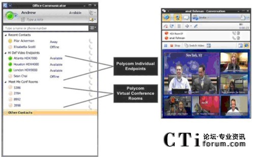 RMX 虛擬會議室出現(xiàn)在 Office Communicator 2007 聯(lián)系人列表上,用戶點擊即可加入多點通話。這樣, 商業(yè)用戶就可以在 PC 和高品質視頻終端上輕松開展協(xié)作,并保持與各方隨時溝通。