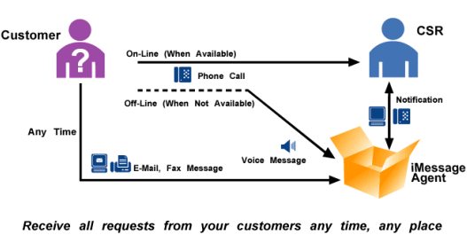 iMessage Agent可與您已有的ACD系統(tǒng)集成,當(dāng)目標(biāo)CSR不在時電話系統(tǒng)就將呼叫交付給iMessage Agent,iMessage Agent接到呼叫之后將對呼叫方進行合適的問候,再將消息存儲在郵件服務(wù)器中。根據(jù)預(yù)定義的規(guī)則,消息會被隨后路由到正確的消息框中。