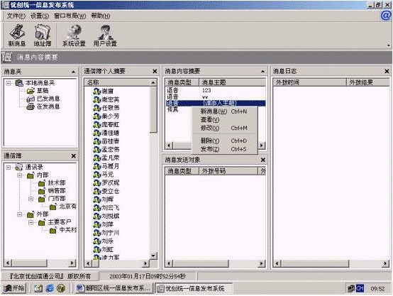 北京優(yōu)創(chuàng)信通科技公司基于完全自主版權的 SmartMessage Pro架構,將 Windows OutLook有機擴展,是集CTI、TTS、CMPP、SMTP/POP3技術的統(tǒng)一消息轉(zhuǎn)換和發(fā)布一體化解決的產(chǎn)品,可以支持Intranet內(nèi)部網(wǎng)的電話語音/傳真、手機短信和Email消息的大量分發(fā)。