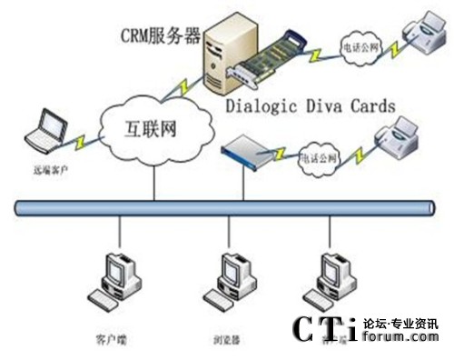 CRM 是專為企業(yè)全力打造的一整套管理解決方案,涉及郵件管理、傳真管理、公司文檔、客戶關(guān)系、產(chǎn)品開發(fā)等各個方面。為企業(yè)提供了一個暢通的以數(shù)據(jù)為基礎(chǔ)的工作和管理平臺。CRM軟件與Dialogic Diva 卡結(jié)合使用能夠?qū)髡媾c企業(yè)的各項業(yè)務活動、管理活動實現(xiàn)高效的無縫整合。圖:與Dialogic Diva 卡結(jié)合的CRM系統(tǒng)結(jié)構(gòu)圖