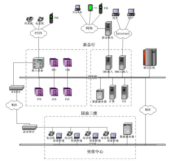 溫州商業(yè)銀行Call Center 項目采用基于Dialogic語音卡的板卡方案,由于坐席分布在兩個不同地方(新總行和國鼎),因此,采用了Intel