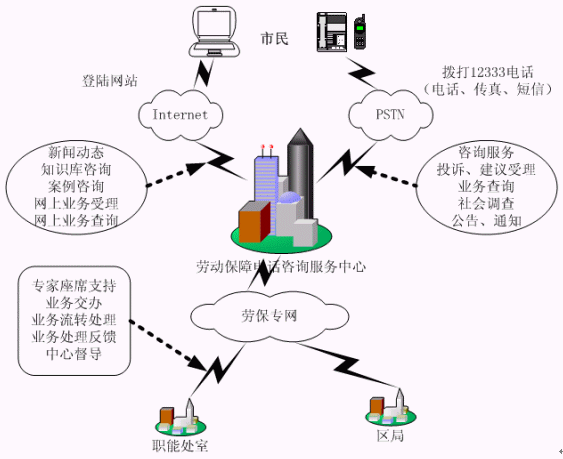 合肥市12333電話咨詢服務(wù)系統(tǒng)的建設(shè),使勞動(dòng)和社會(huì)保障業(yè)務(wù)延伸到市民、企業(yè)的身邊?朔赜蚝蜁r(shí)間的限制,實(shí)現(xiàn)了每天24小時(shí)不間斷地隨時(shí)提供服務(wù)。該系統(tǒng)的建設(shè)將原本分散在各部門的對(duì)外服務(wù)業(yè)務(wù)內(nèi)容,集中在一個(gè)統(tǒng)一的對(duì)外服務(wù)"窗口",并與就業(yè)、失業(yè)、養(yǎng)老、醫(yī)療、生育及勞動(dòng)關(guān)系等管理系統(tǒng)建立接口,實(shí)現(xiàn)資源共享,為勞動(dòng)者提供包括電話、傳真、電子郵件、因特網(wǎng)等多種方式熱線咨詢服務(wù),從而架起勞動(dòng)者與勞動(dòng)部門之間密切聯(lián)系的橋梁,使廣大勞動(dòng)群眾的權(quán)益真正落到了實(shí)處。樹立勞動(dòng)和社會(huì)保障行業(yè)系統(tǒng)的良好服務(wù)形象。推動(dòng)勞動(dòng)保障局管理和服務(wù)的社會(huì)化,實(shí)行全面的標(biāo)準(zhǔn)化、規(guī)范化、制度化和網(wǎng)絡(luò)化的完善的服務(wù)。