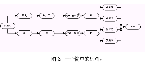 在語音識別中,語言模型是用來指導(dǎo)引擎進(jìn)行語音識別的,它限定了一個識別引擎所能表達(dá)的語句類型。在我們常用的圖搜索引擎中,語言模型是通過語法來表示的,語法是由一系列表示某個領(lǐng)域的語言表達(dá)方式的規(guī)則組成的(語法的具體書寫規(guī)則見引擎使用說明書)。這些規(guī)則會被被轉(zhuǎn)換成詞圖的形式然后用來指導(dǎo)語音的識別。所謂的詞圖是指由詞作為節(jié)點(diǎn)的一個圖,從該圖的開始節(jié)點(diǎn)到末尾節(jié)點(diǎn)的任一條路徑都是一個有效合法的句子。圖2給出了一個簡單的詞圖。