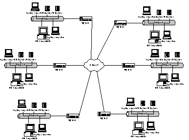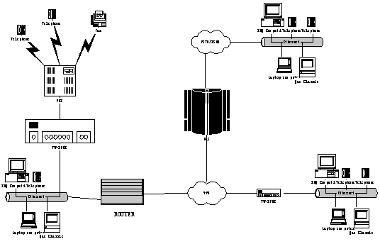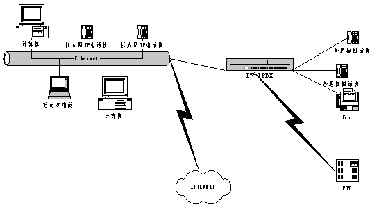 該應用示意圖具有一個(iPBX )或多個辦公場地(nIPBX - 組網iPBX )提供電話系統(tǒng)解決方案。該解決方案是基于IP 電話技術而構建的Tw-IPBX “一體化概念”,同時可提供傳統(tǒng)的模擬電話概念,如模擬電話和傳真機。以下敘述了客戶機組合的單獨應用場景,包括: