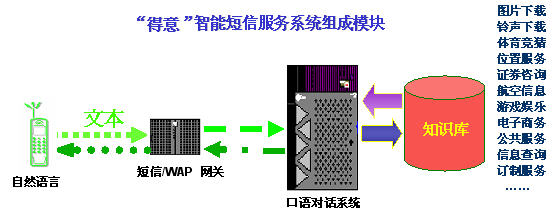 "得意"智能短信系統(tǒng)是在現(xiàn)有的數(shù)據(jù)通信和短信服務(wù)的技術(shù)平臺(tái)上,加入基于中文語(yǔ)言理解技術(shù)的"得意"口語(yǔ)對(duì)話系統(tǒng),從而能夠讓用戶在手機(jī)上以自然語(yǔ)言的形式享受指定領(lǐng)域的智能短信服務(wù)。智能短信系統(tǒng)對(duì)短信文本進(jìn)行自動(dòng)分析和理解,再?gòu)闹R(shí)庫(kù)中提取用戶所需的信息,然后自動(dòng)產(chǎn)生智能應(yīng)答語(yǔ)句,并以短信文本的形式發(fā)回用戶。由于"得意"口語(yǔ)對(duì)話系統(tǒng)具有上下文相關(guān)理解和人機(jī)混合主導(dǎo)等強(qiáng)大功能,在規(guī)定的領(lǐng)域內(nèi),用戶可通過(guò)一個(gè)或者多個(gè)短信構(gòu)成一組對(duì)話,完成復(fù)雜的信息查詢或者其他互動(dòng)服務(wù)。