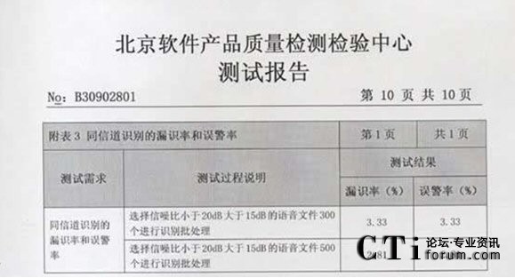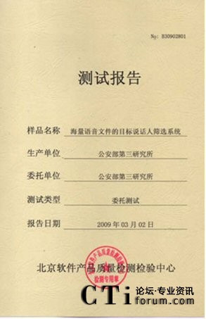 CTI論壇(ctiforum)06月25日消息: 2009年3月02-10日:北京軟件產(chǎn)品質(zhì)量檢測檢驗(yàn)中心對(duì)《海量語音文件的目標(biāo)說話人篩選系統(tǒng)》進(jìn)行了全面測試包括用戶文檔、功能性、可靠性、易用性、可維護(hù)性等多個(gè)特性。測試結(jié)果表明《海量語音文件的目標(biāo)說話 2009年3月02-10日,北京軟件產(chǎn)品質(zhì)量檢測檢驗(yàn)中心對(duì)《海量語音文件的目標(biāo)說話人篩選系統(tǒng)》進(jìn)行了全面人篩選系統(tǒng)》滿足軟件相關(guān)國家標(biāo)準(zhǔn)中的要求,系統(tǒng)在模擬測試環(huán)境中運(yùn)行正常、穩(wěn)定,正式通過北京軟件產(chǎn)品質(zhì)量檢測檢驗(yàn)中心的嚴(yán)格測試,系統(tǒng)的漏識(shí)率和誤警率分別達(dá)到了2.81%和 2.81%。CTI論壇報(bào)道
