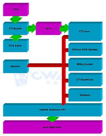 說(shuō)明:圖中所有的設(shè)備都是通過(guò)網(wǎng)絡(luò)和CTI服務(wù)器交互的,我們內(nèi)部都是通過(guò)遠(yuǎn)程監(jiān)控API接口與服務(wù)器通信,也就是說(shuō),只要用戶可以按照遠(yuǎn)程監(jiān)控API的規(guī)范開發(fā)出具有自己特色的計(jì)費(fèi)系統(tǒng)、監(jiān)控系統(tǒng)等等。