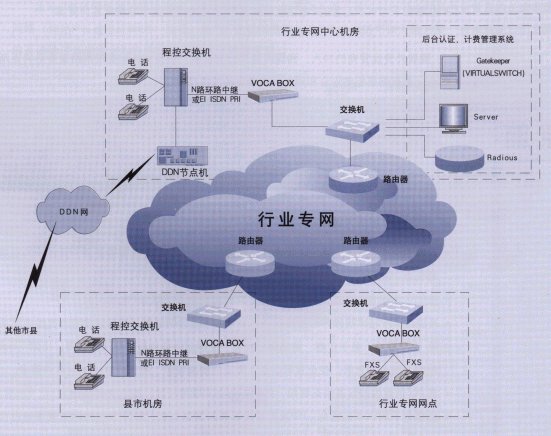 中心并設(shè)立一級計費認(rèn)證及結(jié)算中心、網(wǎng)絡(luò)管理中心(VBMS),對網(wǎng)內(nèi)電話集中管理和計費。通過在各地市機(jī)構(gòu)原有的內(nèi)部網(wǎng)絡(luò)基礎(chǔ)上增加數(shù)臺VOCABOX實現(xiàn)語音終端接入,并在地市機(jī)構(gòu)通過帶FXO接口的VOCABOX實現(xiàn)內(nèi)部IP電話與內(nèi)部電話網(wǎng)絡(luò)的呼叫轉(zhuǎn)接,網(wǎng)絡(luò)拓?fù)溥B接如下圖所示