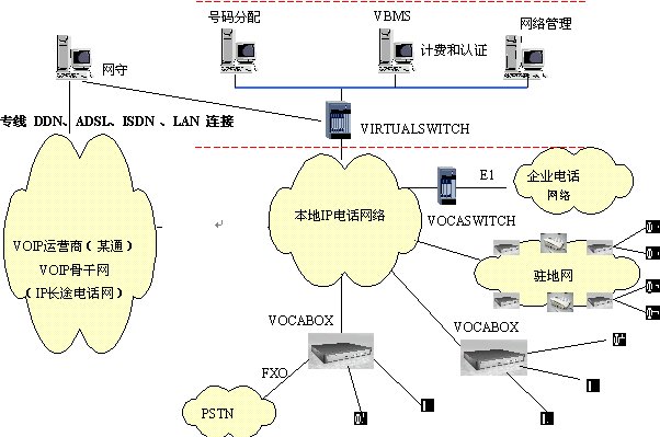 本方案中,企業(yè)電話(huà)網(wǎng)絡(luò)或者駐地網(wǎng)客戶(hù)的電話(huà)網(wǎng)絡(luò)作為大客戶(hù)通過(guò)IP方式或者通過(guò)VOCASWITH的E1端口接入到本地電話(huà)接入網(wǎng)絡(luò)。安裝VIRTUALSWITCH網(wǎng)關(guān)代理系統(tǒng),它作為整個(gè)本地電話(huà)接入網(wǎng)絡(luò)的網(wǎng)守(GATEKEEPER),以集中方式管理域內(nèi)的所有網(wǎng)關(guān)(VOCA-BOX)。