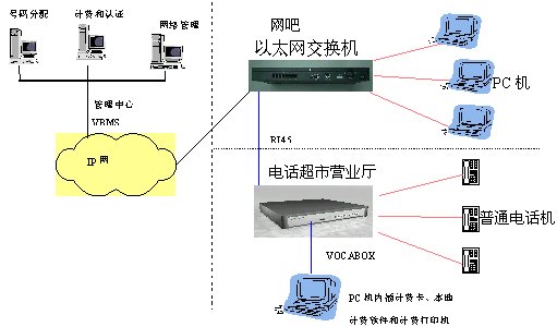 此方案的特點(diǎn)是將電話(huà)終端深入到公用電話(huà)的超市,用戶(hù)可以撥打IP長(zhǎng)途電話(huà)、PSTN普通電話(huà)用戶(hù)及移動(dòng)電話(huà)用戶(hù),并在用戶(hù)端通過(guò)VOCA-BOX語(yǔ)音網(wǎng)關(guān)、計(jì)費(fèi)卡和計(jì)費(fèi)軟件實(shí)現(xiàn)本地營(yíng)業(yè)廳立即計(jì)費(fèi)的要求。在運(yùn)營(yíng)商的管理中心通過(guò)配置VBMS系統(tǒng)實(shí)現(xiàn)后臺(tái)集中計(jì)費(fèi)認(rèn)證功能,用于管理各個(gè)營(yíng)業(yè)中心的VOCA-BOX語(yǔ)音網(wǎng)關(guān),各營(yíng)業(yè)中心的VOCA-BOX語(yǔ)音網(wǎng)關(guān)提供認(rèn)證計(jì)費(fèi)信息給VBMS,計(jì)費(fèi)類(lèi)型可按實(shí)際的需求配置如:預(yù)付費(fèi)、后付費(fèi)等。此方案可以擴(kuò)大ISP及寬帶網(wǎng)絡(luò)運(yùn)營(yíng)商的業(yè)務(wù)市場(chǎng),增加ISP及寬帶網(wǎng)絡(luò)運(yùn)營(yíng)商的收益。