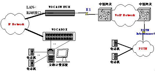 通過(guò)在本地IP電話(huà)網(wǎng)絡(luò)內(nèi)增加一臺(tái)或數(shù)臺(tái)網(wǎng)關(guān)(VOCASWITCH)直接連接到VoIP骨干網(wǎng)絡(luò)的網(wǎng)關(guān)的E1端口,實(shí)現(xiàn)IP電話(huà)呼叫轉(zhuǎn)接。物理連接如圖所示。