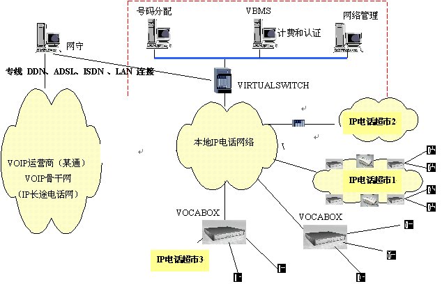 本方案中,各個(gè)超市的電話(huà)網(wǎng)絡(luò)通過(guò)IP方式接入到本地電話(huà)接入網(wǎng)絡(luò)。安裝VIRTUALSWITCH網(wǎng)關(guān)代理系統(tǒng),它作為整個(gè)本地電話(huà)接入網(wǎng)絡(luò)的網(wǎng)守(GATEKEEPER),以集中方式管理域內(nèi)的所有網(wǎng)關(guān)(VOCA-BOX)。