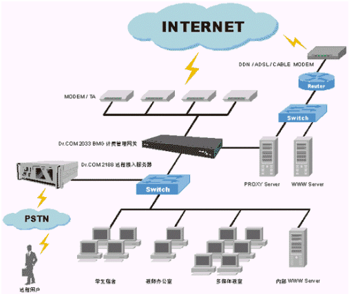 本方案才用Dr.COM 2188遠(yuǎn)程接入服務(wù)器,提供了內(nèi)置的15個(gè)MODEM用作遠(yuǎn)程接入,配套提供專業(yè)開戶、計(jì)費(fèi)、統(tǒng)計(jì)、監(jiān)視和查詢等網(wǎng)絡(luò)版營(yíng)運(yùn)軟件。為校園網(wǎng)未能到達(dá)的地方的用戶(如教師宿舍里的用戶等)提供訪問(wèn)校園網(wǎng)內(nèi)部資源的途徑,另外也對(duì)學(xué)校開展電子圖書館服務(wù)提供有力的支持,外部的用戶可以通過(guò)遠(yuǎn)程接入校園網(wǎng)內(nèi)的電子圖書館的資料,學(xué)校則可以利用2188的計(jì)費(fèi)系統(tǒng)對(duì)此進(jìn)行收費(fèi)。