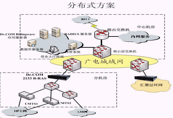 根據(jù)廣電城域網目前網絡的規(guī)模,以及以后的擴展,采用集中接入認證與計費,統(tǒng)一管理的方案,集中接入指:接入服務器部署在各個匯聚層的匯聚點,即在網絡出口安裝寬帶接入服務器,由寬帶接入服務器對所有用戶進行身份認證、接入控制、實時計費、數(shù)據(jù)采集,并將賬單和訪問日志等傳送至綜合業(yè)務系統(tǒng)。統(tǒng)一管理指在中心機房就可以進行全部的管理,包括:網絡設備管理;用戶管理;經營策略管理;賬務管理;安全管理;數(shù)據(jù)分析。提供完整的用戶資料分析,使用習慣分析,運營統(tǒng)計等詳細分析報表。