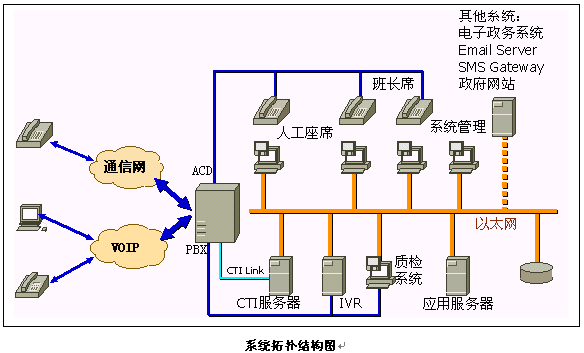 《政府呼叫中心系統(tǒng)》采用聲軟科技的《XCCP呼叫中心系統(tǒng)》平臺(tái),主要由PBX交換機(jī)、CTI服務(wù)器、IVR系統(tǒng)、應(yīng)用服務(wù)器、數(shù)據(jù)庫(kù)服務(wù)器、TTS系統(tǒng)和座席系統(tǒng)等硬件設(shè)備和系統(tǒng)應(yīng)用軟件組成。它以電話(huà)服務(wù)為主要服務(wù)方式、結(jié)合計(jì)算機(jī)信息系統(tǒng)的資料數(shù)據(jù),為用戶(hù)提供全方位的服務(wù)。