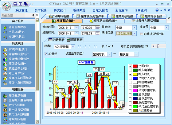座席綜合統(tǒng)計(jì):可以根據(jù)“月份”、“天”、“小時(shí)”來(lái)統(tǒng)計(jì)每一個(gè)座席的綜合指標(biāo)。統(tǒng)計(jì)的指標(biāo)包括:總登錄時(shí)長(zhǎng)、空閑時(shí)長(zhǎng)、呼入電話數(shù)、呼入時(shí)長(zhǎng)、平均呼入時(shí)長(zhǎng)、呼出電話數(shù)、呼出時(shí)長(zhǎng)、平均呼出時(shí)長(zhǎng)、通話總數(shù)、通話總時(shí)長(zhǎng)、后處理時(shí)長(zhǎng)、平均后處理時(shí)長(zhǎng)、AUX總時(shí)長(zhǎng)、電話振鈴時(shí)長(zhǎng)、平均振鈴時(shí)長(zhǎng)、轉(zhuǎn)移次數(shù)、磋商次數(shù)、保持次數(shù)、平均保持時(shí)長(zhǎng)。