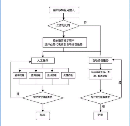 客戶打入電話后,當系統(tǒng)的自動語音應答子系統(tǒng)無法解決客戶問題時,客戶可選擇人工服務,由鐵路客戶服務代表直接接聽客戶電話,處理并解決客戶問題。此時客戶同座席話務人員直接溝通,并同時記錄下該客戶的聯(lián)系方式,將相關數據添加入系統(tǒng)數據庫;也可以在數據庫的支持下回答國家和地方的鐵路信息及相關規(guī)定等的咨詢和疑問?蛻粢部梢赃x擇自動語音服務方式,根據系統(tǒng)的語音提示輸入按鍵,選擇類別,將自己的投訴和建議以及自己的聯(lián)系方式信息以留言錄音的方式保存在系統(tǒng)中。系統(tǒng)同時還支持自動傳真方式,客戶可以通過傳真機進入本系統(tǒng),通過按鍵選擇傳真方式,將自己的意見建議等的文本內容傳真給系統(tǒng),系統(tǒng)自動接受并存入數據庫。
