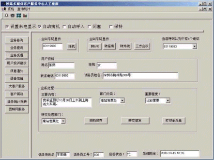 客戶服務中心系統(tǒng)將為鐵路局提供強勁的客戶關系管理能力,自動業(yè)務導航能力,交互式協(xié)作能力,并可通過基于各業(yè)務代表技能特點的路由選擇,將客戶來話接到最符合要求的業(yè)務代表處,對于老客戶還可以建立一對一的關系,將老客戶的來話直接接到以前曾與之通過話的業(yè)務人員處,使其倍感親切。同時,高度集中的客戶服務中心可以使鐵路部門用最低成本向旅客、貨主提供最有保證的服務和支持,不論在商機管理、客戶服務、還是顧客群維系等諸多方面,都是客戶服務中心發(fā)揮其巨大作用的領域。鐵路部門充分利用客戶服務中心的優(yōu)勢,可以帶來無限商機,通過電話回訪等手段,既能樹立良好的企業(yè)形象,又能提供完善的服務。這樣對增強客戶忠誠度,保持原有的客戶群,降低顧客流失率和擴大新的顧客群都將起到很好地作用。