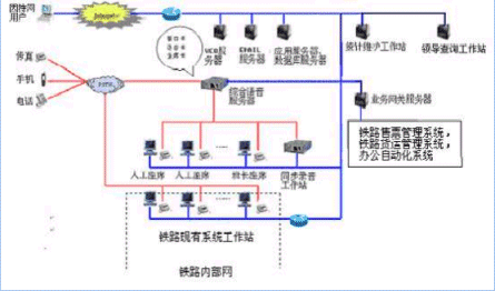 客戶利用電話、傳真、電子郵件、因特網、手機、網絡電話等撥打某統(tǒng)一特服號碼(如100xxxx)進入鐵路客戶服務中心系統(tǒng),本系統(tǒng)依托鐵路各類業(yè)務技術支持系統(tǒng)和網絡系統(tǒng),通過人工受理或自動語音服務等方式全天24小時不間斷地為旅客、貨主提供各種鐵路服務;形成了對外服務于客戶,對內管理、分析、決策系統(tǒng)相結合的新型客戶服務中心。