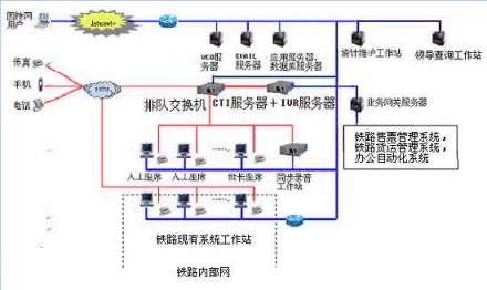 鐵路客戶服務中心系統(tǒng)主要是由帶語音板卡的計算機或排隊交換機、CTI服務器、IVR服務器、應用服務器/數據庫服務器、人工座席系統(tǒng)等硬件設備和應用軟件組成。它以電話服務為主要服務方式、結合計算機信息系統(tǒng)的資料數據,為客戶提供全方位的服務,包括業(yè)務查詢、業(yè)務咨詢、業(yè)務受理、投訴和建議、市場調查等功能。