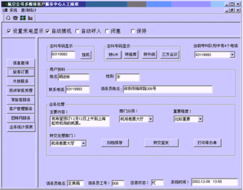 。。客戶打入電話后,當系統(tǒng)的自動語音應(yīng)答子系統(tǒng)無法解決客戶問題時,客戶可選擇人工服務(wù),由航空公司客戶服務(wù)代表直接接聽客戶電話,處理并解決客戶問題。此時客戶同座席話務(wù)人員直接溝通,并同時記錄下該客戶的聯(lián)系方式,將相關(guān)數(shù)據(jù)添加入系統(tǒng)數(shù)據(jù)庫;也可以在數(shù)據(jù)庫的支持下回答機場航班/航空貨運信息及相關(guān)規(guī)定等的咨詢和疑問、訂座/訂艙?蛻粢部梢赃x擇自動語音服務(wù)方式,根據(jù)系統(tǒng)的語音提示輸入按鍵,選擇類別,將自己的投訴和建議以及自己的聯(lián)系方式信息以留言錄音的方式保存在系統(tǒng)中。系統(tǒng)同時還支持自動傳真方式,客戶可以通過傳真機進入本系統(tǒng),通過按鍵選擇傳真方式,將自己的意見建議等的文本內(nèi)容傳真給系統(tǒng),系統(tǒng)自動接受并存入數(shù)據(jù)庫。