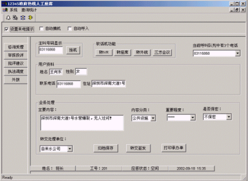 系統(tǒng)提供強大的信息資料處理功能,座席可記錄舉報、投訴、批評、建議等記錄單,將信息資料歸檔保存、打印受理單或?qū)⑹芾韱蔚任募D交簽發(fā)相關政府職能部門;系統(tǒng)引入CRM(Customer