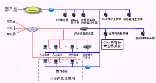 網(wǎng)上服務(wù)系統(tǒng):與INTENET結(jié)合,接受來自網(wǎng)上的呼叫請(qǐng)求,提高服務(wù)和營銷的質(zhì)量和效率。