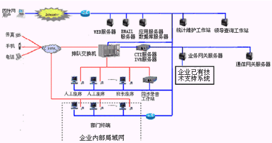 本系統(tǒng)物理結(jié)構(gòu)由帶語音板卡的工控機(jī)或排隊(duì)交換機(jī)、CTI服務(wù)器、IVR(交互式語音應(yīng)答)/IFR(交互式傳真應(yīng)答)服務(wù)器、業(yè)務(wù)代表座席(邏輯上分為:普通業(yè)務(wù)代表座席、專家座席等)、班長座席、統(tǒng)計(jì)維護(hù)管理工作站、因特網(wǎng)(WEB)服務(wù)器、電子郵件(EMAIL)服務(wù)器、數(shù)據(jù)庫/應(yīng)用服務(wù)器、錄音留言工作站、領(lǐng)導(dǎo)查詢工作站、業(yè)務(wù)網(wǎng)關(guān)服務(wù)器、通信網(wǎng)關(guān)、網(wǎng)絡(luò)系統(tǒng)等構(gòu)成。