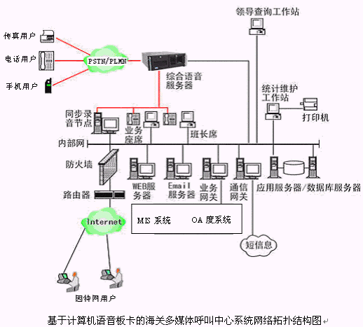 本多媒體呼叫中心的物理結(jié)構(gòu)由帶語音板卡的高工控機、CTI服務(wù)器、IVR(交互式語音應答)/IFR(交互式傳真應答)服務(wù)器、業(yè)務(wù)代表座席(邏輯上分為:普通業(yè)務(wù)代表座席、專家座席、WEB座席等)、班長座席/質(zhì)檢座席、統(tǒng)計維護管理工作站、因特網(wǎng)(WEB)服務(wù)器、電子郵件(EMAIL)服務(wù)器、數(shù)據(jù)庫/應用服務(wù)器、錄音留言工作站、領(lǐng)導查詢工作站、業(yè)務(wù)網(wǎng)關(guān)服務(wù)器、通信網(wǎng)關(guān)服務(wù)器、網(wǎng)絡(luò)系統(tǒng)等和應用軟件構(gòu)成。