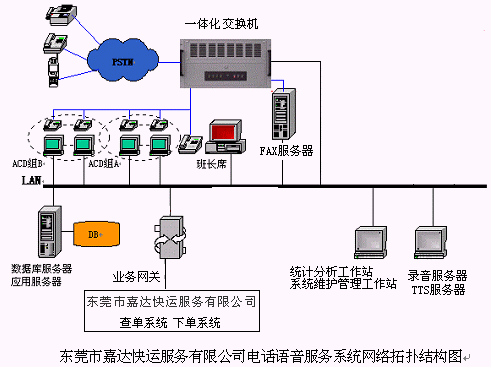 48個(gè)人工座席,落單組為30個(gè)人工座席(其中1個(gè)為落單組班長(zhǎng)座席),查詢組為18個(gè)人工座席(其中1個(gè)為查詢組班長(zhǎng)座席),48路全程同步錄音(可以實(shí)時(shí)設(shè)置或取消),64路IVR, 24路TTS通道,4路傳真,64條模擬中繼線路接入,支持普通話、廣東話等多語(yǔ)種服務(wù)的語(yǔ)音合成(TTS);提供各種話音、傳真集成服務(wù),提供辦公時(shí)間服務(wù)流程與非辦公時(shí)間服務(wù)流程,人工服務(wù)落單,自助落單,貨物在途狀況人工服務(wù)查詢,貨物在途狀況自助查詢,業(yè)務(wù)咨詢,語(yǔ)音信箱,傳真服務(wù)等業(yè)務(wù)功能,實(shí)現(xiàn)與后臺(tái)下單系統(tǒng),貨物在途狀況查詢系統(tǒng),GPS系統(tǒng)等的無(wú)縫集成,為客戶提供24小時(shí)全天候的快捷優(yōu)質(zhì)服務(wù)。