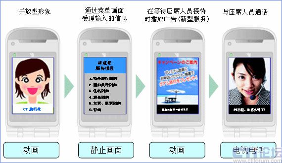 以往的IVR根據(jù)選擇項(xiàng)、層數(shù),必須多遍聽(tīng)取語(yǔ)音內(nèi)容才能找到預(yù)期的菜單,成了一大課題。視頻呼叫中心則在FOMA的畫(huà)面上顯示服務(wù)菜單,通過(guò)選擇號(hào)碼可以簡(jiǎn)化聽(tīng)取語(yǔ)音的過(guò)程。而且,在連接客服人員的電話等待時(shí)間中可以播放廣告。通過(guò)靈活運(yùn)用這些功能,提高了IVR的操作性,提供了新型廣告宣傳的機(jī)會(huì)。