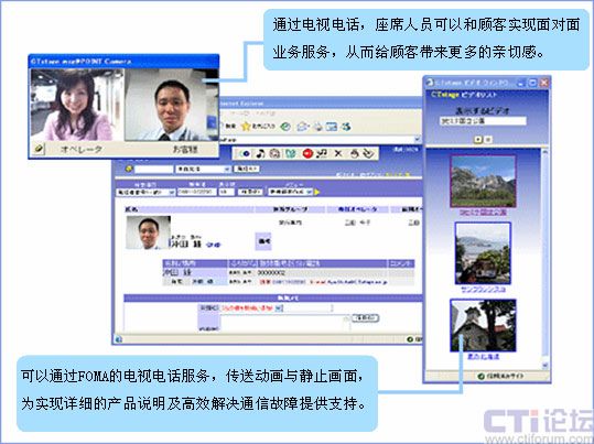 通過(guò)“FOMA”的電視電話服務(wù),可以實(shí)現(xiàn)面對(duì)用戶(hù)的表情進(jìn)行服務(wù)。而且,例如,可以實(shí)時(shí)把握故障發(fā)生地點(diǎn)等只用語(yǔ)言無(wú)法準(zhǔn)確傳遞的信息。進(jìn)而,客服人員可以通過(guò)FOMA的電視電話功能送出動(dòng)畫(huà)、靜止畫(huà)面,利用這些畫(huà)面說(shuō)明情況。通過(guò)靈活運(yùn)用這些功能,為實(shí)現(xiàn)顧客和企業(yè)之間的熱情友好、高效細(xì)致的通信提供支持。