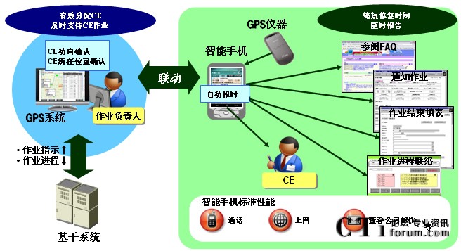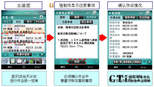“MoBiz AP for CE支持系統(tǒng)”是在支持保修人員在工作現(xiàn)場作業(yè)的同時,實現(xiàn)總部對工作現(xiàn)場“可視化”管理的應(yīng)用程序軟件包。