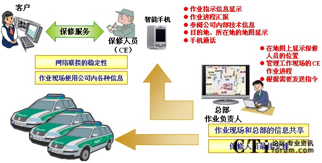 “MoBiz AP for CE支持系統(tǒng)”在加強(qiáng)總部和現(xiàn)場維修人員的聯(lián)動基礎(chǔ)上,通過準(zhǔn)確把握地點信息和作業(yè)進(jìn)展?fàn)顩r,有效安排工作人員,從而達(dá)到提高工作人員一天的工作現(xiàn)場訪問次數(shù)。進(jìn)一步說,有助于客戶SLA(注3)的遵守和客戶滿意度(CS)的提高。