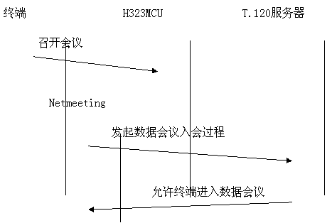 采用帶外方式,數(shù)據(jù)與音頻視頻流分開,各自占用帶寬。與終端和MCU無任何關(guān)系。如果用戶想召開數(shù)據(jù)會議,需要單獨的一臺PC機來進行數(shù)據(jù)的接受與傳送,所有需要數(shù)據(jù)會議功能的用戶的PC機都連接到一個T.120服務(wù)器上。目前常用的終端軟件是Netmeeting軟件。數(shù)據(jù)占用單獨的帶寬,不擠占音視頻的帶寬。會議建立過程為: